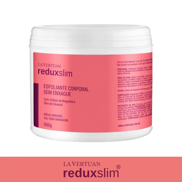 O Esfoliante Sem Enxague REDUX SLIM® LA VERTUAN é um esfoliante de média abrasão ideal para todos os protocolos corporais. Retira as células mortas da pele, deixando sua textura mais uniforme e preparando a pele para receber os ativos do tratamento. Traz praticidade e economia para a profissional, pois o mesmo esfoliante é utilizado como sal para bandagem (não precisa ser retirado da pele). Depois de realizar a esfoliação, o produto se transforma em uma loção suave. E a profissional ganha tempo em cabine, pois não precisa retirar o produto da pele. Inovação para a sua clínica! O Esfoliante Sem Enxague REDUX SLIM® LA VERTUAN é ideal para diversos tratamentos corporais, em especial para protocolos de tratamento para Lipedema, Detox Corporal, Redução de Medidas, entre outros.
